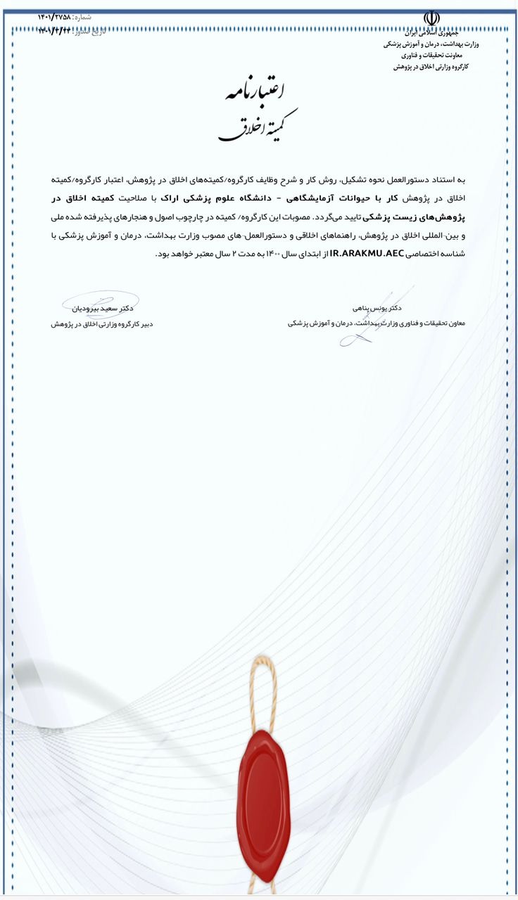 اخذ اعتبار نامه کمیته اخلاق در پژوهش کار با حیوانات آزمایشگاهی برای دانشگاه علوم پزشکی اراک ۰۱ تیر ۱۴۰۱ | ۰۷:۲۲ کد : ۲۷۲۴۶ اطلاعیه ارسال به دیگران نام شما ایمیل شما ایمیل دریافتکننده ارسال انصراف تعداد بازدید:۱۸۲۲۰