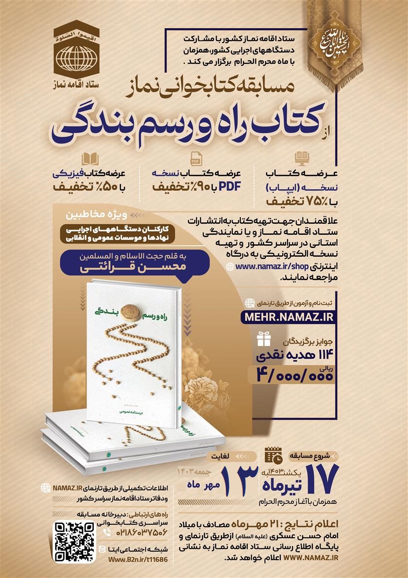 با عنایت به ضرورت موضوع نماز به عنوان مهم‌ترین معروف و در راستای رهنمودهای حکیمانه مقام معظم رهبری (مد ظله العالی) در خصوص ضرورت ایجاد سازوکارهای موثر بر گرایش به مطالعه کتاب و افزایش سبد مطالعاتی آحاد جامعه و در بین کارکنان دستگاه‌های اجرایی ، مسابقه سراسری کتابخوانی  از منبع  ((راه و رسم بندگی)) ویژه کارکنان محترم دستگاه‌های اجرایی تالیف حجت الاسلام والمسلمین استاد محسن قرائتی از تاریخ ۱۷ تیر ماه سال جاری لغایت 13 مهر به صورت آزمون بر خط برگزار می گردد.