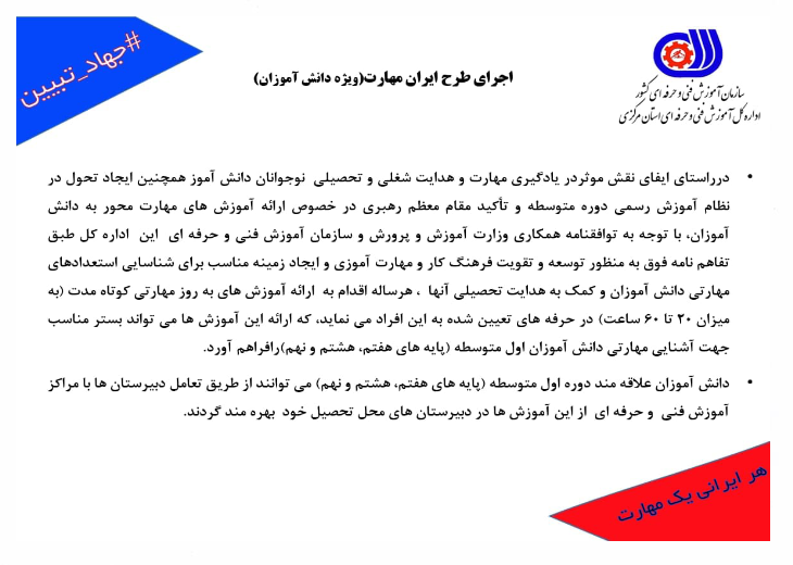 اداره کل آموزش فنی و حرفه ای استان مرکزی در راستای معرفی فعالیتهای سازمان مربوطه در زمینه ارائه آموزش های مهارتی و ماموریت های ذاتی این اداره در نظر دارد فعالیت های کلی صورت گرفته در مجموعه خویش را در قالب طرحی تحت عنوان " سه شنبه های مهارتی " به شرح ذیل انجام دهد.