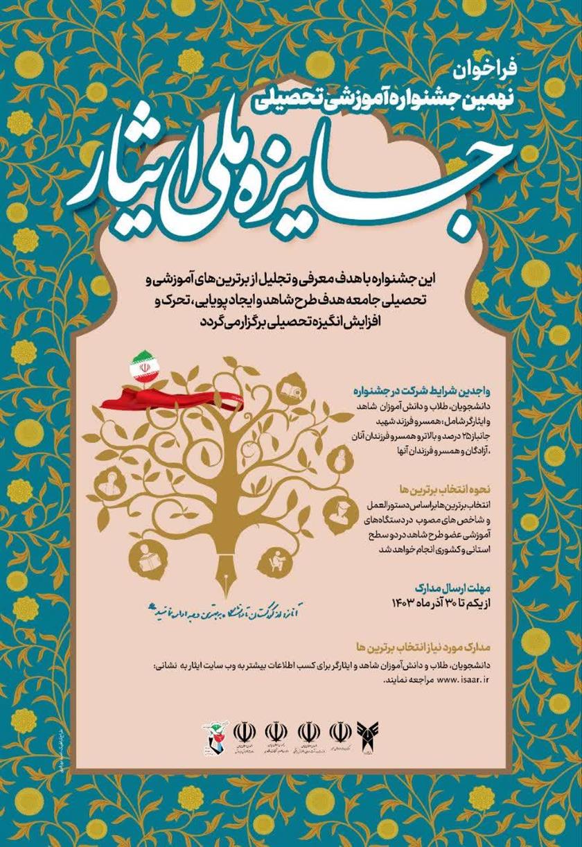 بنا بر اعلام بنیاد شهید و امور ایثارگران،  نهمین جشنواره آموزشی تحصیلی جایزه ملی ایثار برگزار می گردد.