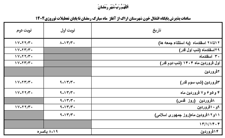 اعلام ساعات پذیرش اهدا کنندگان محترم در پایگاه انتقال خون شهرستان در ماه مبارک رمضان ۲۸ اسفند ۱۴۰۳ | ۱۳:۰۸ کد : ۵۰۲۶۹ اطلاعیه ارسال به دیگران نام شما ایمیل شما ایمیل دریافتکننده ارسال انصراف تعداد بازدید:۷۷۴۶ اعلام ساعات پذیرش اهدا کنندگان محترم در پایگاه انتقال خون شهرستان در ماه مبارک رمضان