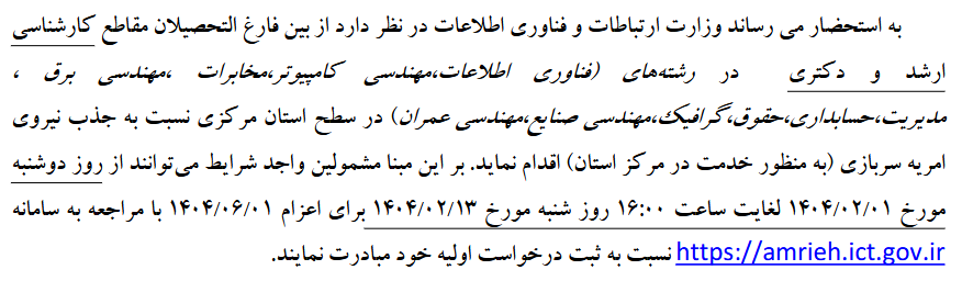 چهارمین مرحله جذب نیروی امریه سربازی در وزارت ارتباطات و فناوری اطلاعات ۲۷ فروردین ۱۴۰۴ | ۱۵:۱۱ کد : ۵۰۸۰۸ اطلاعیه ارسال به دیگران نام شما ایمیل شما ایمیل دریافتکننده ارسال انصراف تعداد بازدید:۴۷۳۳ فراخوان چهارمین مرحله جذب نیروی امریه سربازی در وزارت ارتباطات و فناوری اطلاعات