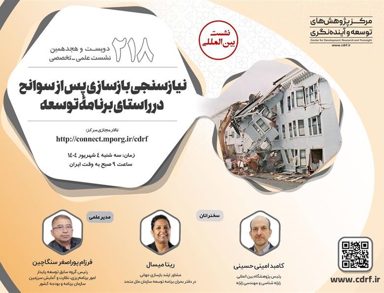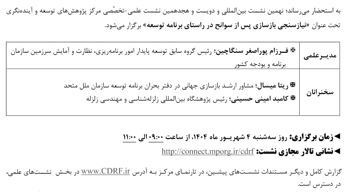 نشست علمی نیاز سنجی بازسازی سوانح در راستای برنامه توسعه ۰۳ شهریور ۱۴۰۴ | ۱۲:۳۷ کد : ۵۴۰۰۰ اطلاعیه ارسال به دیگران نام شما ایمیل شما ایمیل دریافتکننده ارسال انصراف تعداد بازدید:۲۰۶۱ نشست علمی نیاز سنجی بازسازی سوانح در راستای برنامه توسعه، توسط مرکز پژوهش های توسعه و آینده نگری برگزار می گردد.