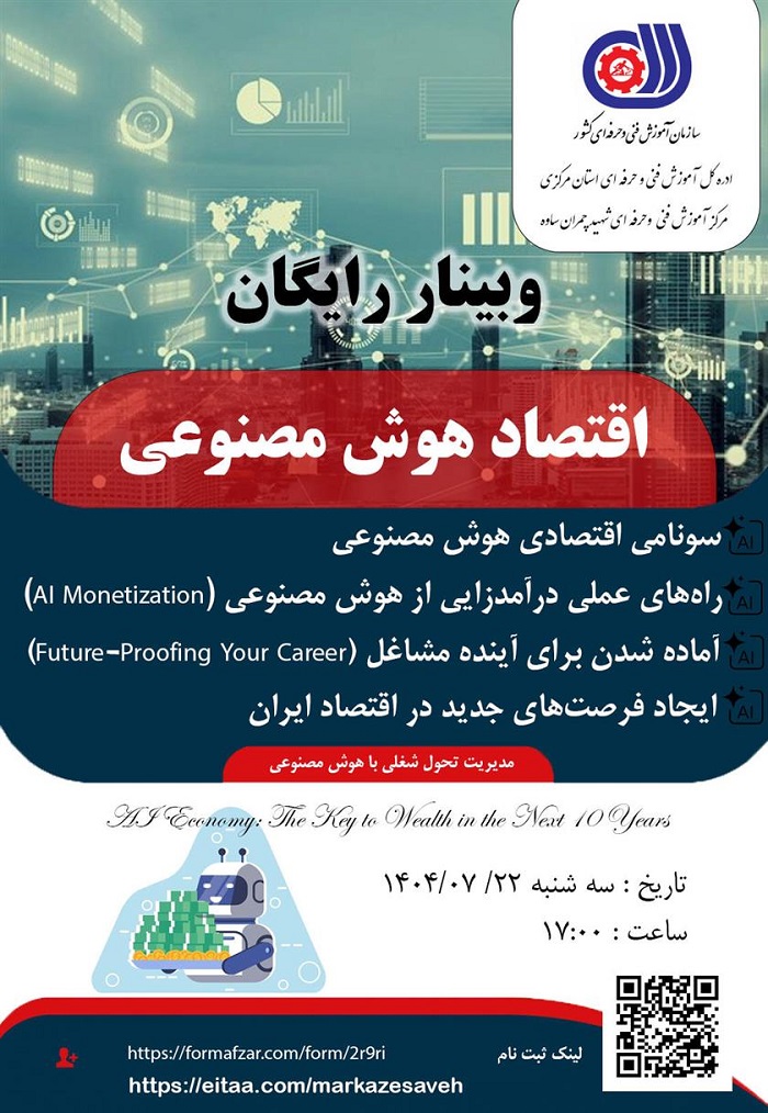 به اطلاع می رساند امروزه هوش مصنوعی (AI) نه صرفاً یک ابزار تکنولوژیک بلکه به عنوان یک سونامی اقتصادی در حال بازآفرینی مدل های کسب و کار و مشاغل در سطح جهانی به شمار می آید. در همین  راستا مرکز آموزش فنی و حرفه ای شهید چمران ساوه نسبت به برگزاری وبینار آموزشی یک روزه تحت عنوان « اقتصاد هوش مصنوعی » با هدف تمرکز بر درآمدزایی عملی از هوش مصنوعی (Al Monetization، آماده سازی برای آینده مشاغل Future - Proofing Your Career) و شناسایی فرصت های جدید اقتصادی برای نیروی کار ماهر کشور را برنامه ریزی نموده است.