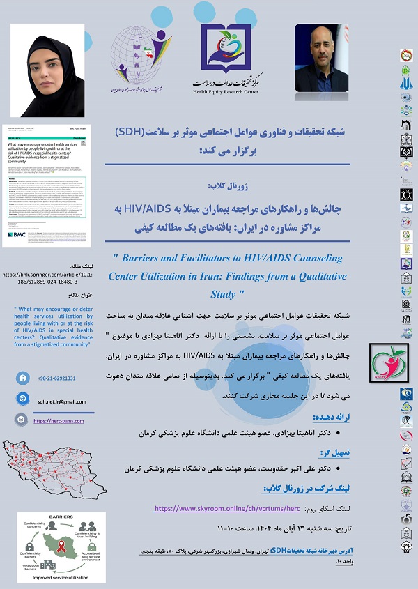 شبکه تحقیقات و فناوری عوامل اجتماعی موثر بر سلامت وزارت بهداشت و درمان، جهت آشنایی علاقه مندان به مباحث عوامل اجتماعی موثر بر سلامت، نشستی را با ارائه دکتر آناهیتا بهزادی با موضوع " چالش ها و راهکارهای مراجعه بیماران مبتلا به HIV/AIDS به مراکز مشاوره در ایران، یافته های یک مطالعه کیفی" را به صورت مجازی برگزار می کند .