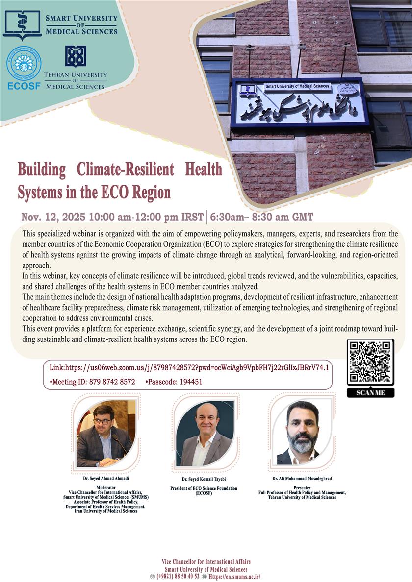 به اطلاع می رساند، در راستای توسعه فعالیتهای منطقه ای و بین المللی و با عنایت به هماهنگی های به عمل آمده با سازمان همکاری های اقتصادی (ECO) و در راستای توسعه گردشگری سلامت، وبینار بین المللی با  با عنوان " Building Climate Resilience Health Systems in the ECO Region " با سخنرانی آقای دکتر مصدق راد، استاد دانشگاه علوم پزشکی تهران، به صورت مجازی و به زبان انگلیسی، با ظرفیت محدود (100 نفر) برگزار می گردد.