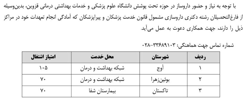 جذب نیروی داروساز مشمول قانون خدمت ۲۵ آذر ۱۴۰۴ | ۰۹:۰۰ کد : ۵۷۰۵۷ اطلاعیه ارسال به دیگران نام شما ایمیل شما ایمیل دریافتکننده ارسال انصراف تعداد بازدید:۱۷۸۸ جذب نیروی داروساز مشمول قانون خدمت در دانشگاه علوم پزشکی قزوین
